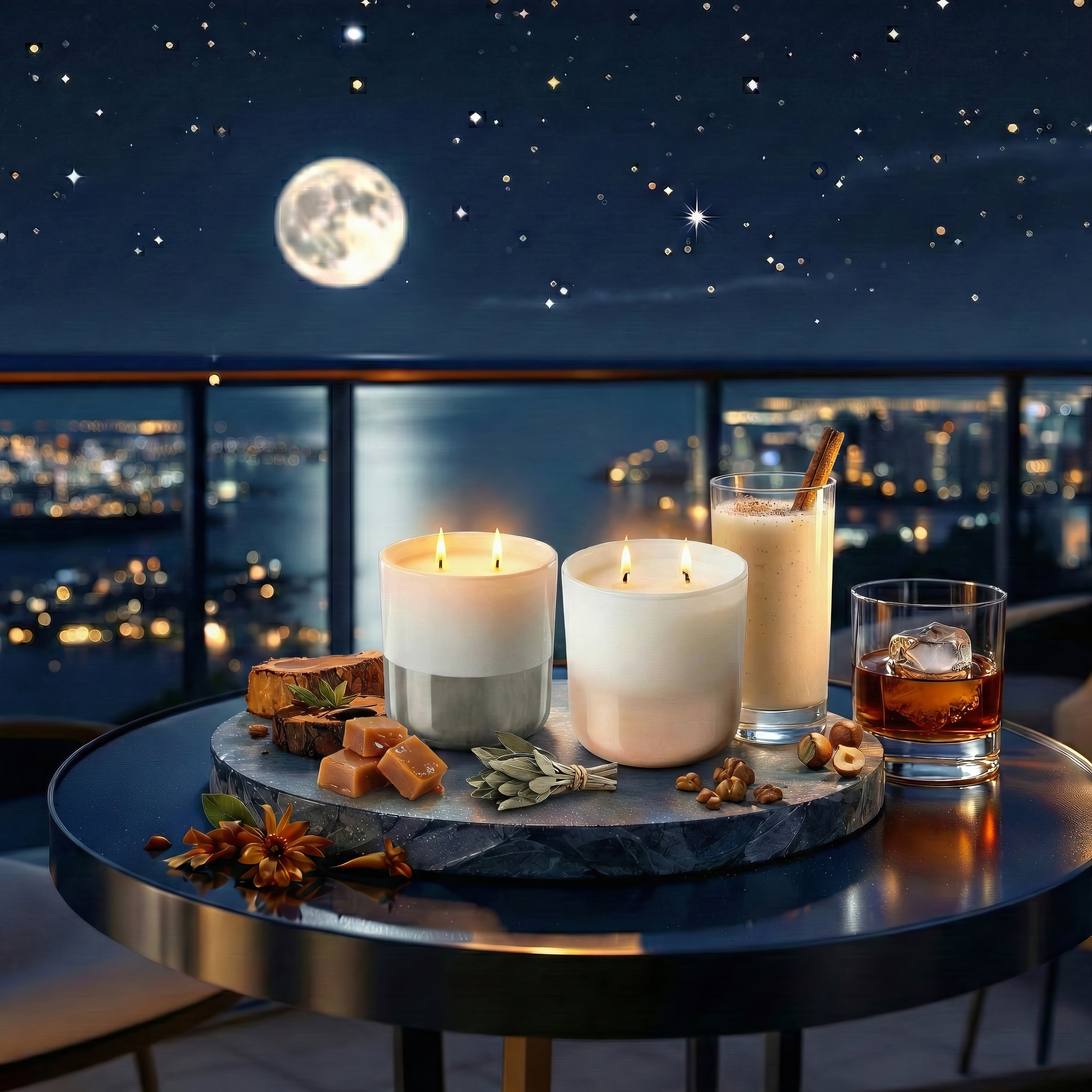 Wistful Starlight ignites the soft, magnetic essence of feminine serenity with an enchanting fusion of creamy horchata and praline sweetness, intertwined with spiced rum warmth and toasted hazelnut allure. This scent conjures the luxurious comfort of settling onto a plush windowsill with a decadent sip while gazing toward a star-strewn night sky as moonlight washes the room in ethereal calm, infusing your space with gentleness and subtle sensuality. Ideal for sparking intimacy or enveloping repose, Wistful Starlight radiates irresistible elegance, complementing its masculine counterpart to create a dynamic balance.